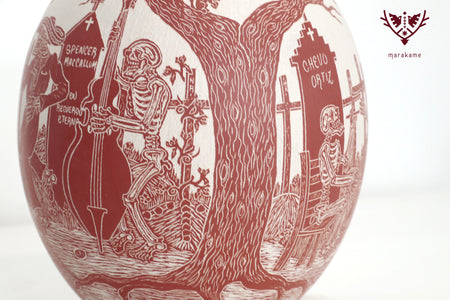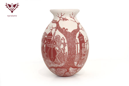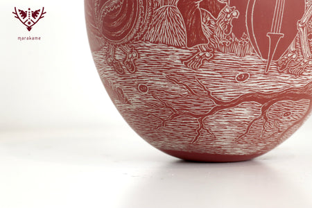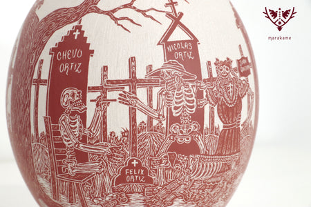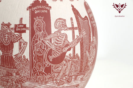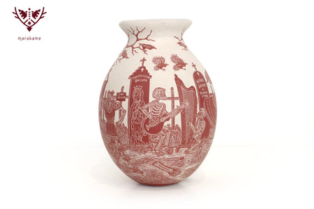 In this ceramic piece by Mata Ortiz, cIt captures an emblematic scene of the Day of the Dead: Catrinas wandering through the cemetery among crosses, tombs, and skeletal musicians playing funeral melodies. The meticulous engraving and red ceramic finish highlight the details of Mexican folklore, evoking the coexistence of life and death that characterizes this ancestral celebration.