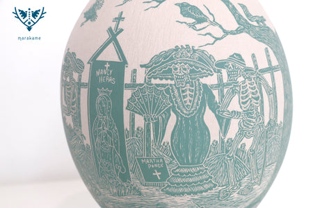 In this ceramic piece by Mata Ortiz, it is It presents a Day of the Dead scene where a Catrina and a skeleton knight meet in a cemetery surrounded by crosses and bare branches. The green palette against a light background lends a serene, nocturnal air, evoking the symbolism of the cemetery as a meeting point between the living and the dead. The engraved lines highlight the style of Mexican folk art, maintaining the tradition and humor that characterize this celebration.